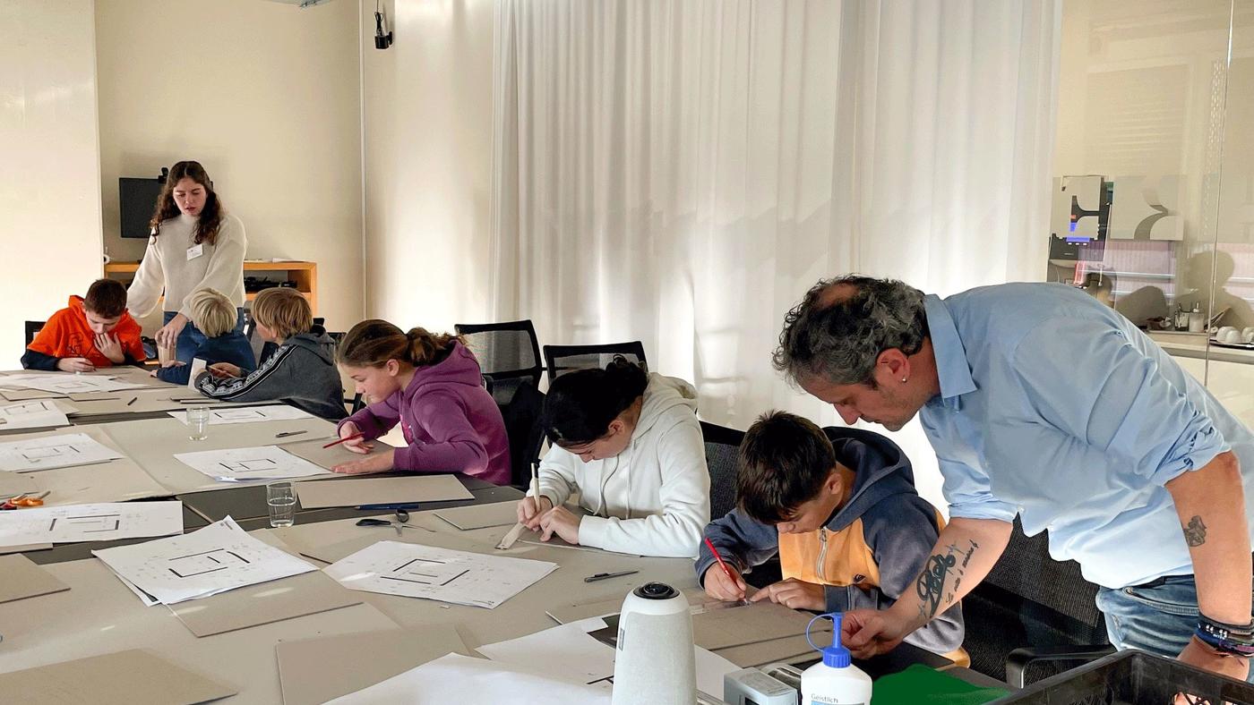 Und das Interesse war schnell geweckt. «Wir nehmen sie in Empfang und nach einer ersten Erkundungstour durch das Open Space-Büro im Transitlager, bereiten wir sie auf das Thema Hausbau vor», erklärt Gugliuzzo, Die Mädchen und Jungs nahmen Lernenden und Begleitpersonen in Beschlag und löcherten sie mit Fragen. Wie muss ich die Pläne interpretieren, wie beginnt die Planung eines Hauses, was bedeutet der Grundriss 1:50, was gehört alles zum Hausbau und wie realisiere ich ein 3D-Modell? Die Kinder sind gefordert. Eifrig wird gezeichnet, zugeschnitten, gefaltet und geklebt. Die fertigen Modell-Häuschen lassen sich sehen. Bekanntlich macht die Arbeit auch hungrig. In der zNüni-Pause gab’s für alle «Grättimänner», das Programm wurde mit Pizza zum Mittagessen abgerundet. Auch in diesem Punkt zeigten sie ihre Kreativität. Die Pizzaresten wurden in der Kartonschachtel zu einem schönen Kreis drappiert.