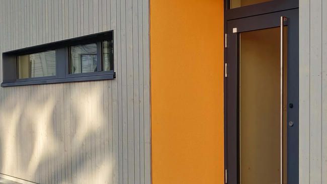 Das Projekt umfasst ein kompaktes, zweigeschossiges Gebäude mit einem Betonsockel und vorbewitterter Holzverschalung im MINERGIE-P-Standard.