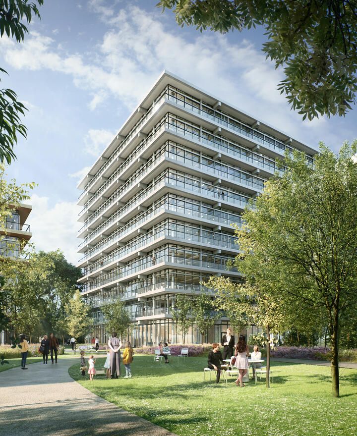 Dank der doppelten Bauhöhe von 40 Metern bleibt Platz für eine grosszügige, öffentliche Parkanlage hinter dem Gebäude. Rapp hat für das ALBA HAUS bei der Entwicklung des Mobilitätskonzepts mitgewirkt, welches aufzeigt, wie die Anreise mit dem Fahrrad und dem öffentlichen Verkehr gefördert werden kann. So wurden zahlreiche gedeckte Veloparkplätze samt Garderoben und Duschen realisiert.